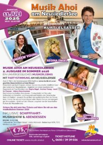Zum 2. Mal in der Sommersaison 2026 heißt es: Leinen los für ein unvergessliches Konzerterlebnis auf dem Wasser! Präsentiert von Kurti Elsasser, erleben Sie eine traumhafte Schifffahrt über den malerischen Neusiedlersee – begleitet von einem musikalischen Feuerwerk mit Top-Künstlern wie: Regina Engel – Andrew Young – Jennifer Elsasser – Johann Rosenhammer